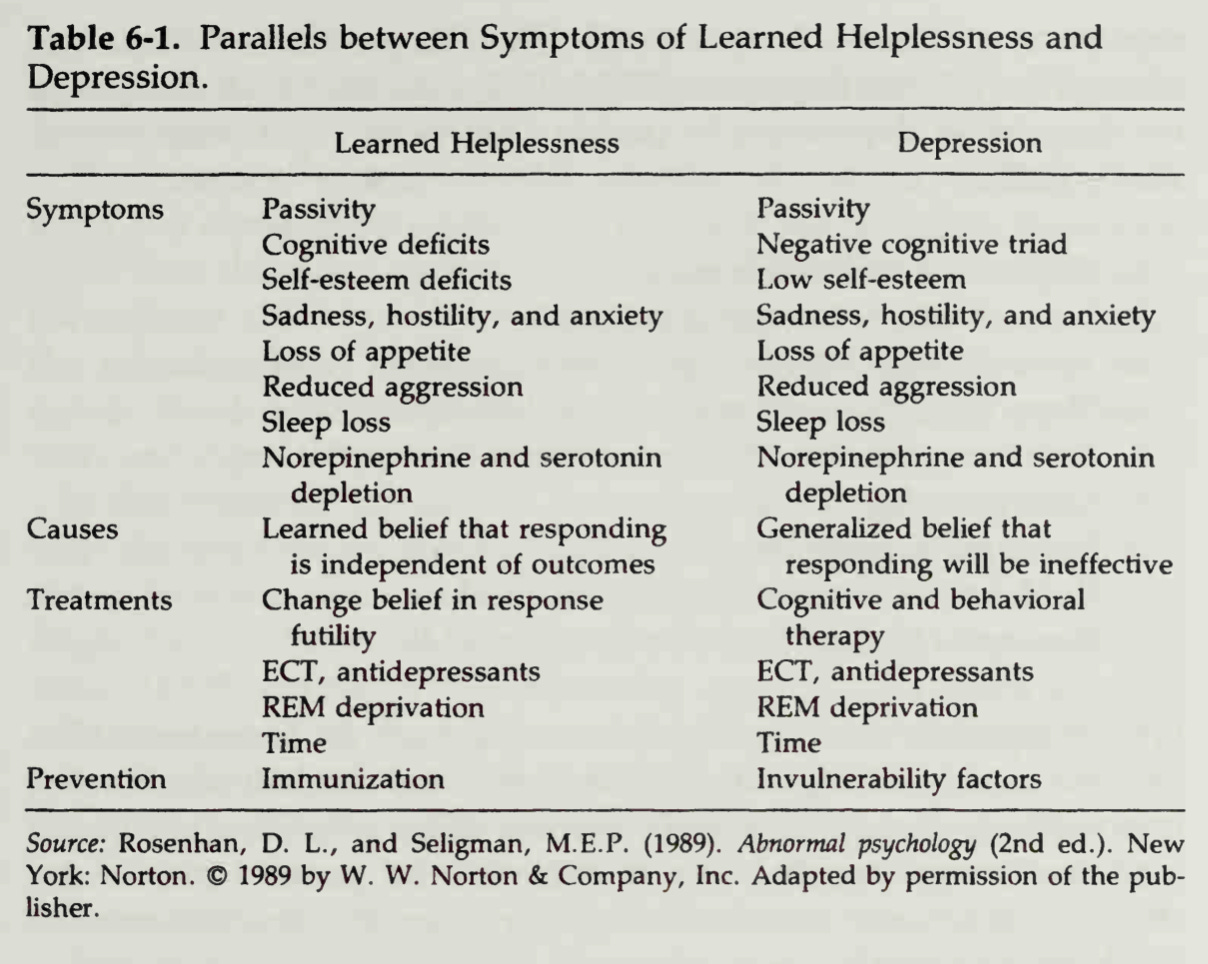 The psychologist, Martin Seligman, noticed striking similarities between the symptoms of depression and learned helplessness. So much so, that he concluded that learned helplessness is depression.