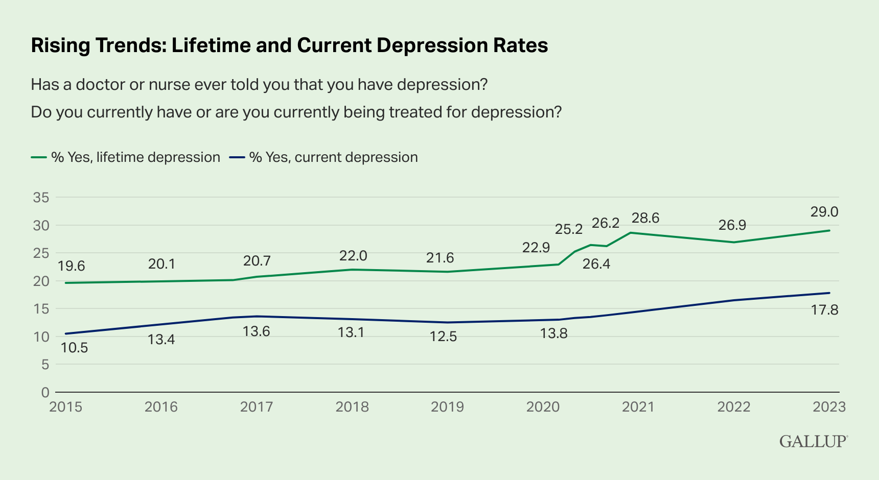 According to a 2023 Gallup study, 29% of U.S. adults have been diagnosed with depression at some point in their lives. This number has increased by 10 percentage points since 2015.